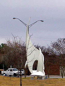 | Modern art that looks like a whale. Light post behind art gives it the tail. |